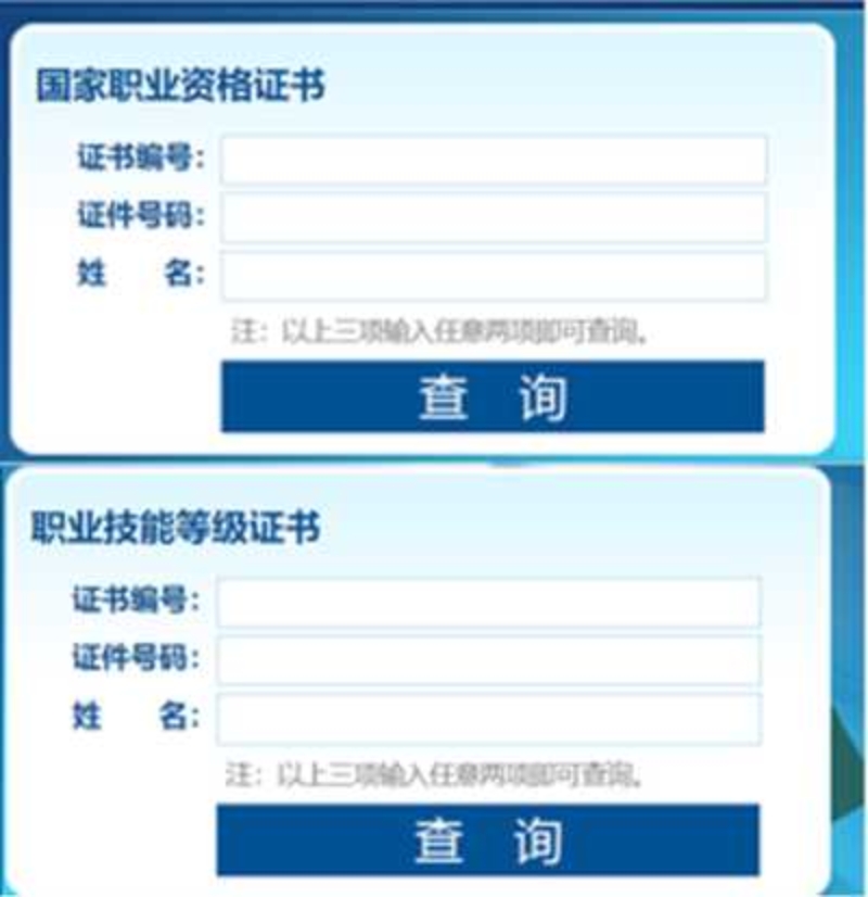 登录技能人才评价证书全国联网(http://www. osta.org.cn),输入“证件号码” “姓名”中任意一项以及 “证书编号”即可查询。
