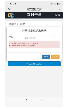 3.进入缴费界面:确认缴费信息无误后,进行缴费。点击缴费后,需要输入手机号,方便后续查询发票,输入正确手机号,然后点击“保存”。