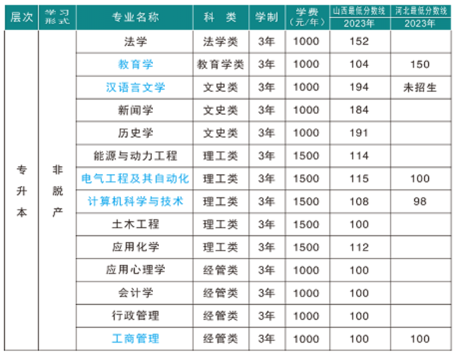 注:河北省只招收蓝色字体的专业;以上专业、学费等信息以山西招生考试网、河北省教育考试院官网公布的信息为准。