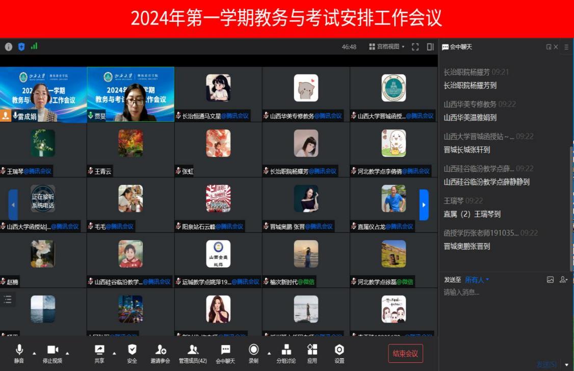 本次会议中,教学科王婷老师对学生课程学习、考试、成绩管理等相关事宜进行详细讲解;雷成娟主任对教务、考试工作做出安排:一是各教学点工作人员坚持问题导向,学会在职责范围内规范有效处理问题;二是各教学点教务老师要提升专业水平,在熟悉教务、考务工作职责基础上,梳理优化办事流程;三是加强过程管理和结果追踪,对于学期学习进度低和考试不合格课程的学生予以预警处理。最后,学院贾旻副院长就下阶段工作提出明确要求:一是坚持教育公益属性,推进我校学历继续教育工作规范适度、高质量发展;二是落实立德树人根本任务,教务人员要细心、耐心地帮助学生解决学习中遇到的困难;三是加强制度建设,规范教学管理;四是校内校外教务人员共同努力,确保我校学历继续教育工作顺利开展。