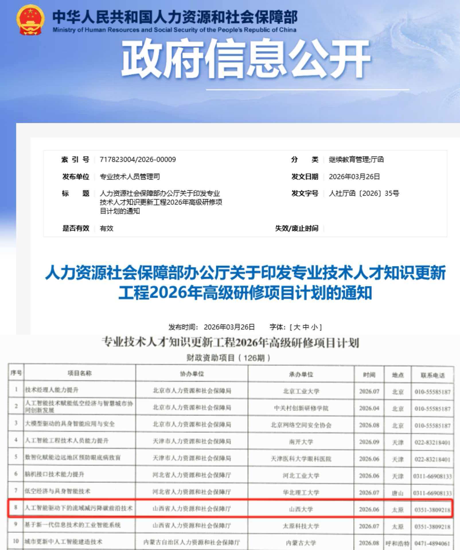 近日,人力资源和社会保障部办公厅发布《人力资源社会保障部办公厅关于印发专业技术人才知识更新工程2026年高级研修项目计划的通知》(人社厅函〔2026〕35号),9728太阳集团申报的“人工智能驱动下的流域减污降碳前沿技术”研修项目成功入选该计划,充分彰显了学校在相关领域的学科积淀与人才培养优势。