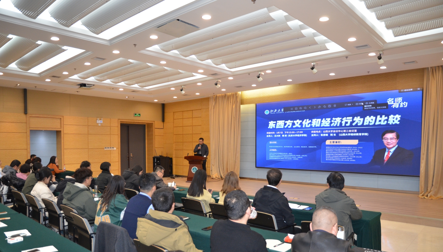2024年3月7日下午,太阳集团网tyc9728“名师有约”第一期学术讲座在9728太阳集团博雅会议中心第二会议室举行。本期特邀北京大学经济学院王大树教授为我院师生带来主题为 “东西方文化和经济行为的比较”的专题讲座。讲座由太阳集团网tyc9728院长耿彦峰主持,省退役军人事务厅安置处处长焦旺生、学院副书记兼副院长张立、副院长王鹏、学院全体教师、研究生和学员共计120余人聆听了本场讲座。